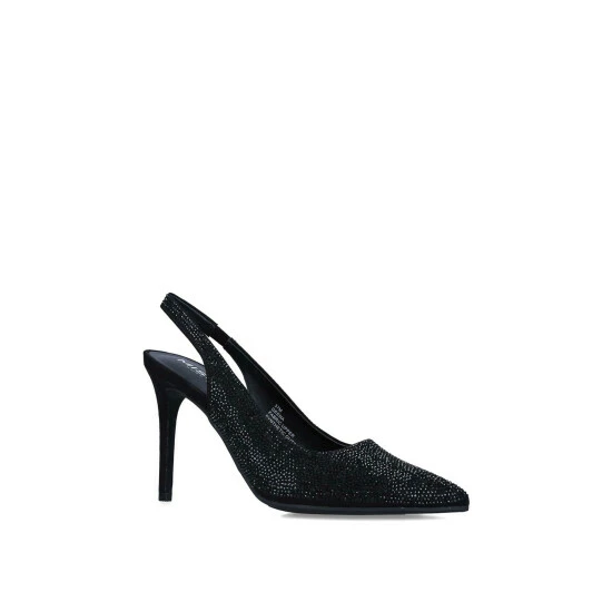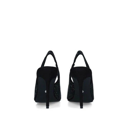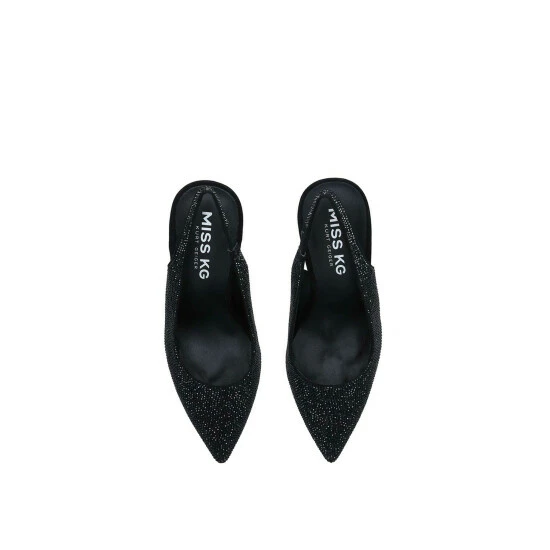 Geena from Miss KG is a court shoe with a stiletto heel, featuring a stylish open back and a sleek black upper embellished with jewels. The toe is pointed.