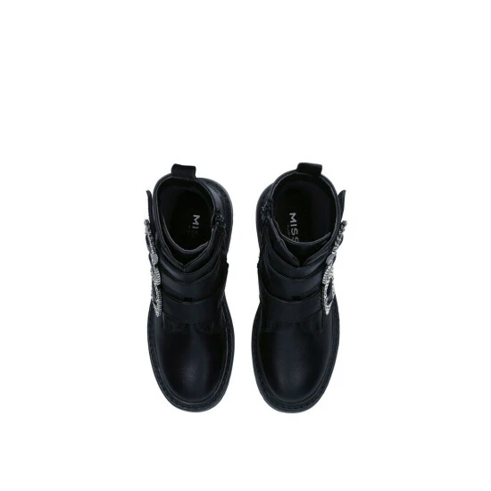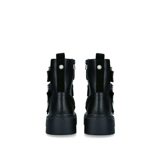 Iris from Miss KG is a black biker boot with 3 big, jewel embellished buckles and a chunky lug style sole.
