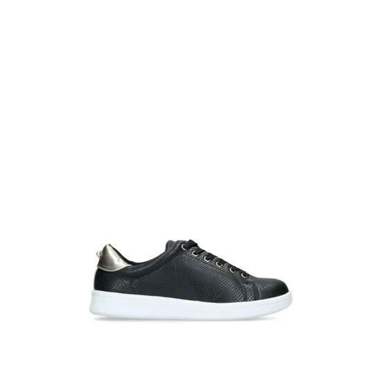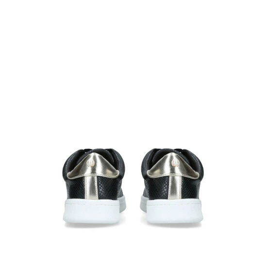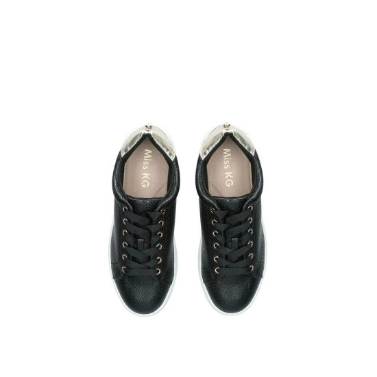 Go for a contemporary look on your days off with the Kori trainer by Miss KG. The best-selling trainer is now available in black with mock croc detailing on the upper and contrasting white sole. This style is made for all-day comfort and finished with gold hardware and a metallic heel.