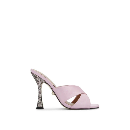 The Peyton heels are a sleek style with a cross over detail at the strap. The pink satin features an embellished heel with rose jewels.