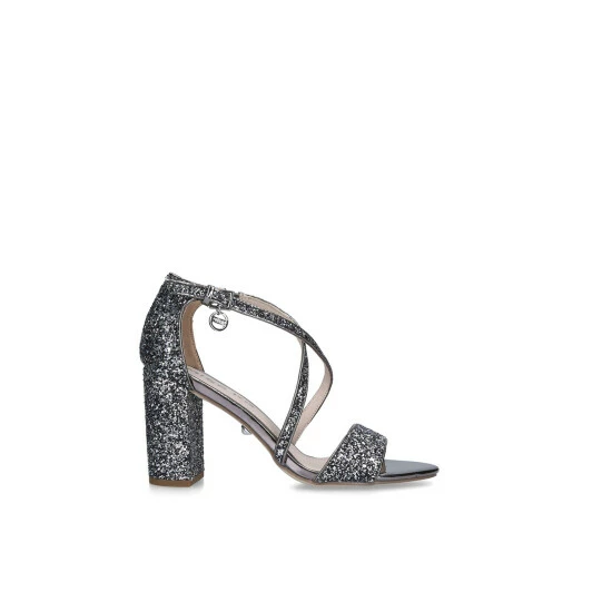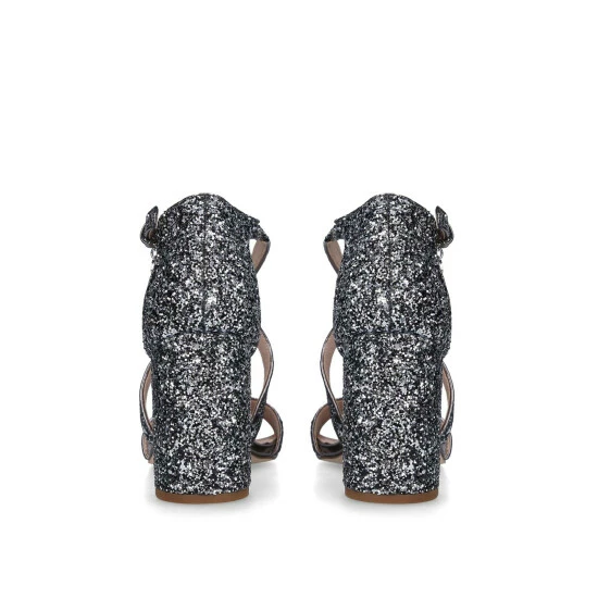 The Phoenix Glitter heel from Miss KG, features a silver jewel encrusted exterior. With sleek upper straps and a branded patent on the buckle.