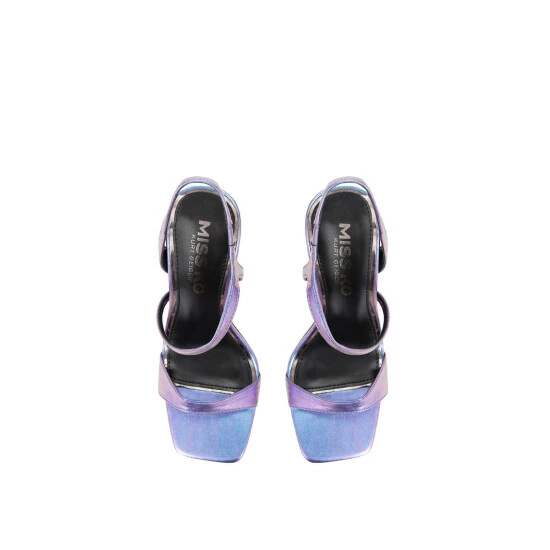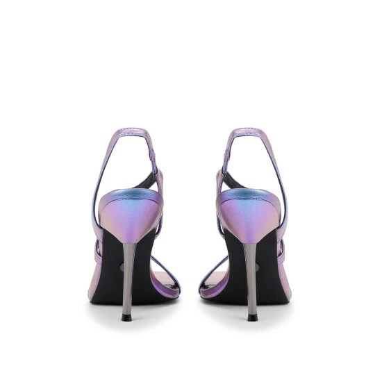 The Priya heels are a strappy chrome style with a cross over detail at the ankle.